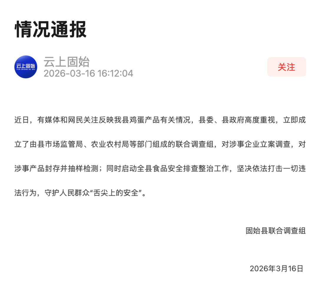 3月16日,固始县融媒体中心发布情况通报表示,固始县县市场监管局、农业农村局等部门已组成联合调查组,对涉事鸡蛋产品展开了立案调查。对涉事产品封存并抽样检测;同时启动全县食品安全排查整治工作,坚决依法打击一切违法行为。