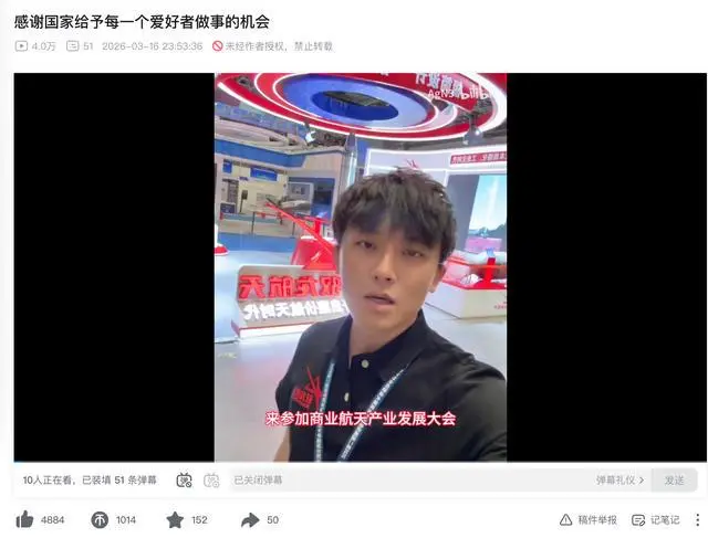 3月16日,卢驭龙正式亮相行业展会的前一天,他在社交平台发布一则视频:“感谢国家给予每一个爱好者做事的机会。”评论区满是网友的暖心留言,“主播还在坚持啊!”“我从学生看到上班五六年了”“谢谢你帮我完成我小时候的梦想”……卢驭龙表示,“我们公司就想提供一个新的思路,廉价航天。我相信市场需要各种新方案涌现,百花齐放形成良性竞争。”
