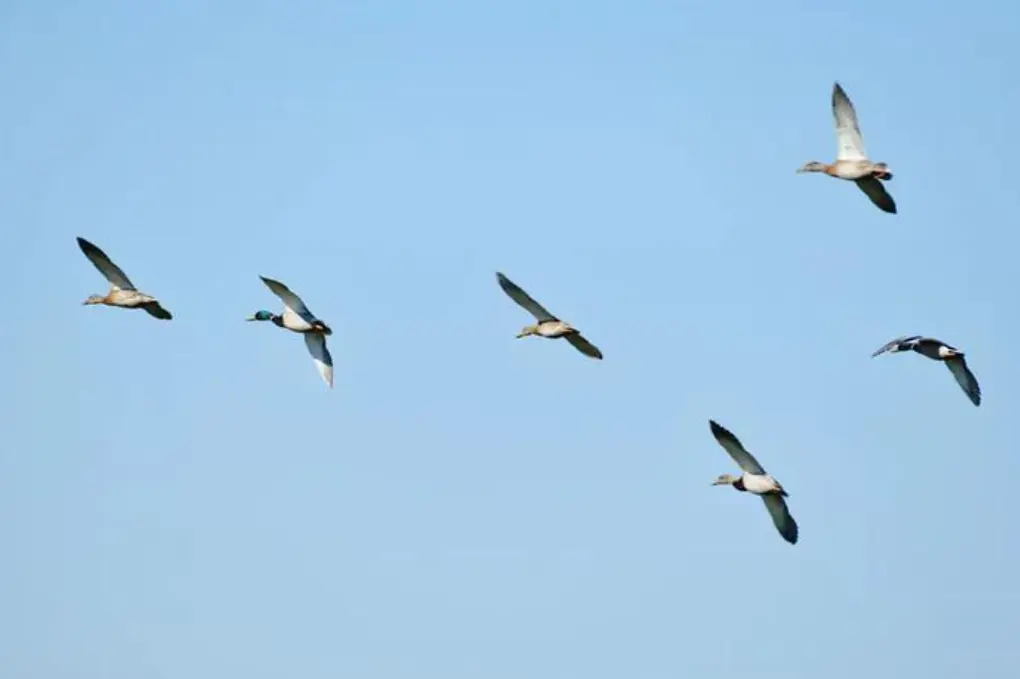 这是因为绿头鸭有流线型身体,能把风阻降低27%,它的翅膀还有特殊的羽缘结构,能消除气流噪音。这套配置,让它们不仅能飞得高,还能飞得远。不过,跟鸡差不多,驯化后,那些擅长飞的鸭子基本上也被淘汰的差不多了。