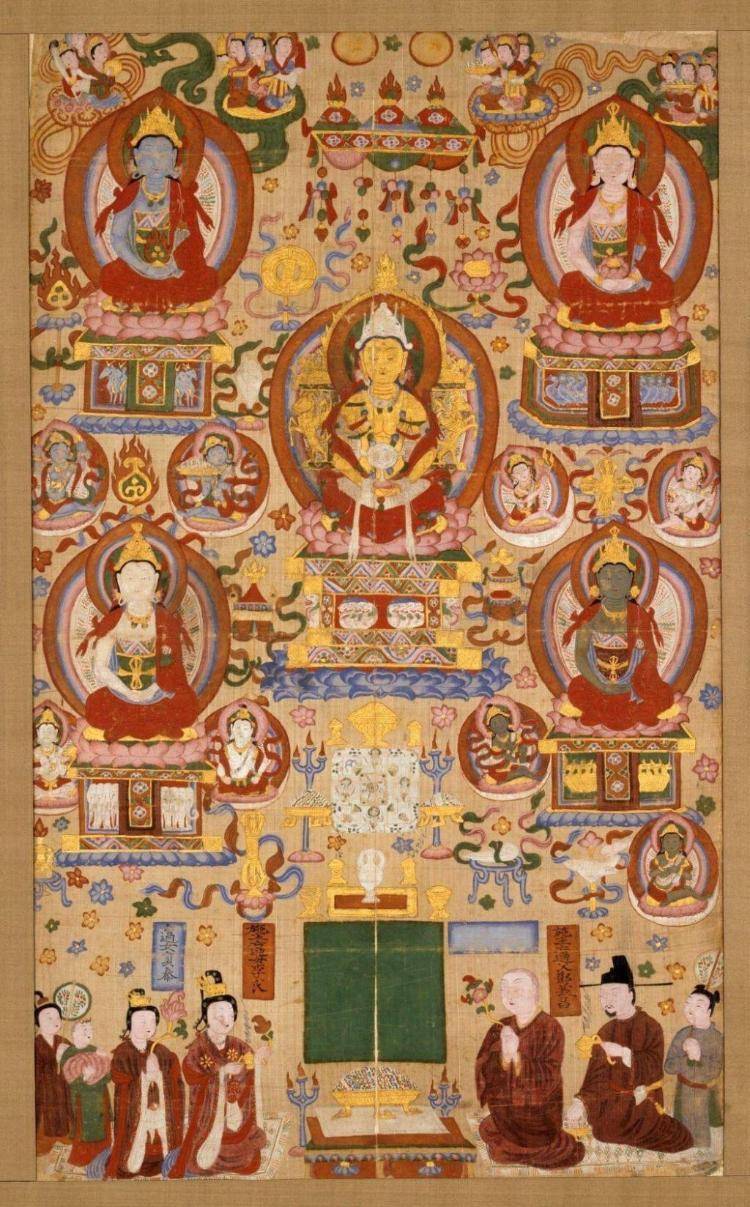 收藏于巴黎吉美博物馆的《五方五佛的曼陀罗》,是伯希和从敦煌带回法国的佛画。它表现的是曼陀罗(也译为坛城)这种神秘的佛教绘画。画中使用了奢华的金箔,令人联想到摩尼教手稿和吐鲁番的绘画。同时,画作中使用的冷色调蓝色则让人想到青金石,这种色调在稍晚的绘画中有所使用,并且可能是由来自于阗的难民带到敦煌的。