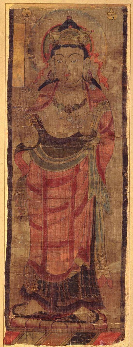 《披袈裟菩萨立像幡》是伯希和收集的敦煌绢画中保存较为完整和精美的一幅,伯希和为此画命名为《披袈裟菩萨立像幡》,现藏于巴黎吉美博物馆。